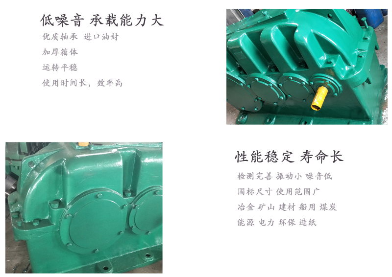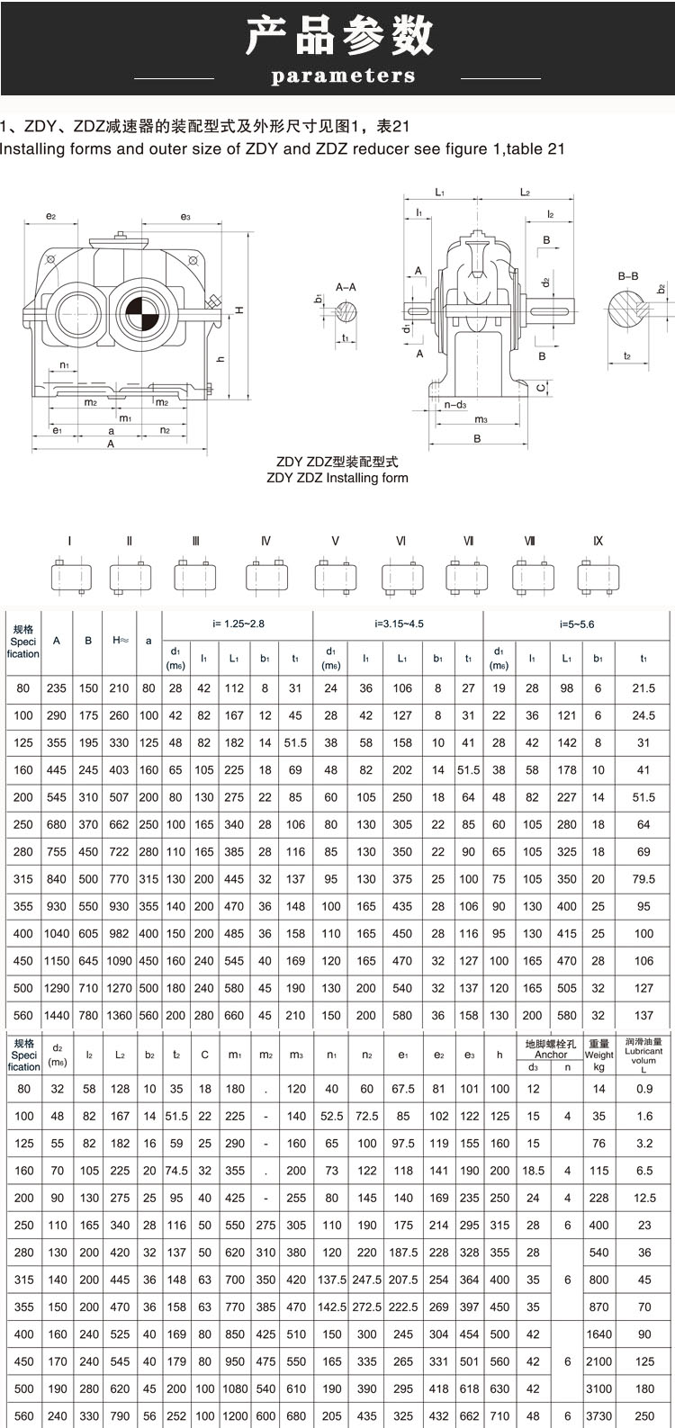 ZDY355-5.6-IV硬齿面齿轮减速机为单级传动,只有一级输入轴,一级输出轴,输出轴上一个大齿轮与高速轴咬合,传动比较小,输出转速快。355为中心距,5.6为传动比,IV为第四种装配型式,产品有严格的质量检测,品质值得信赖,齿轮,齿轴均采用低碳合金钢锻件,强度大,经48小时渗碳,淬火,成型磨齿而成,硬度和精度都大,承载的能力也大,适用于各类大功率,大转矩,重载场合。