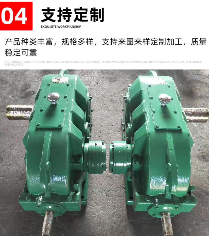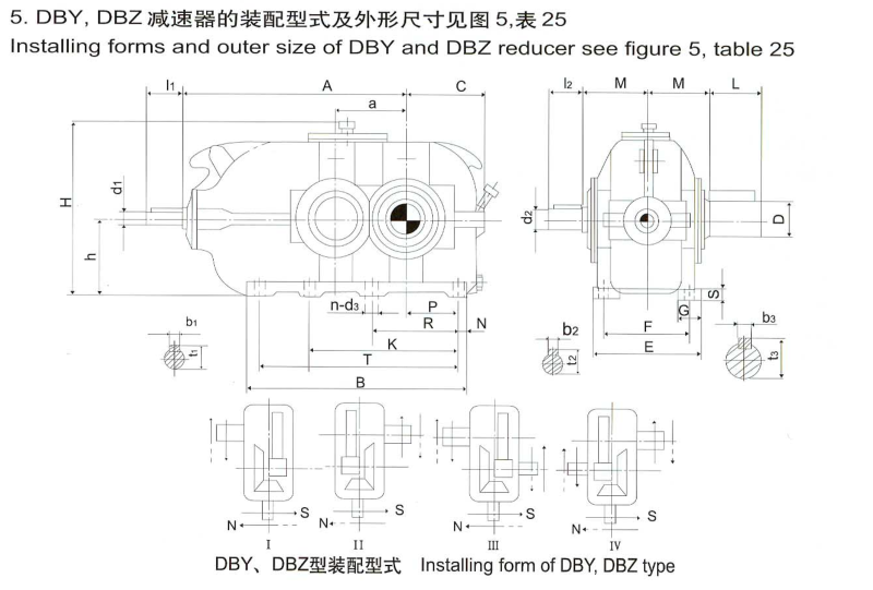 DBY、DBYK、DCZ型减速器各有12种规格,名义中心距为:160、180、200、224、250、280、315、355、400、355、400、450、500、560mm;每种规格均有5种传动比(8、10、11.2、12.5、14),两种旋向,(七)种装配式,分别组成240种减速器。