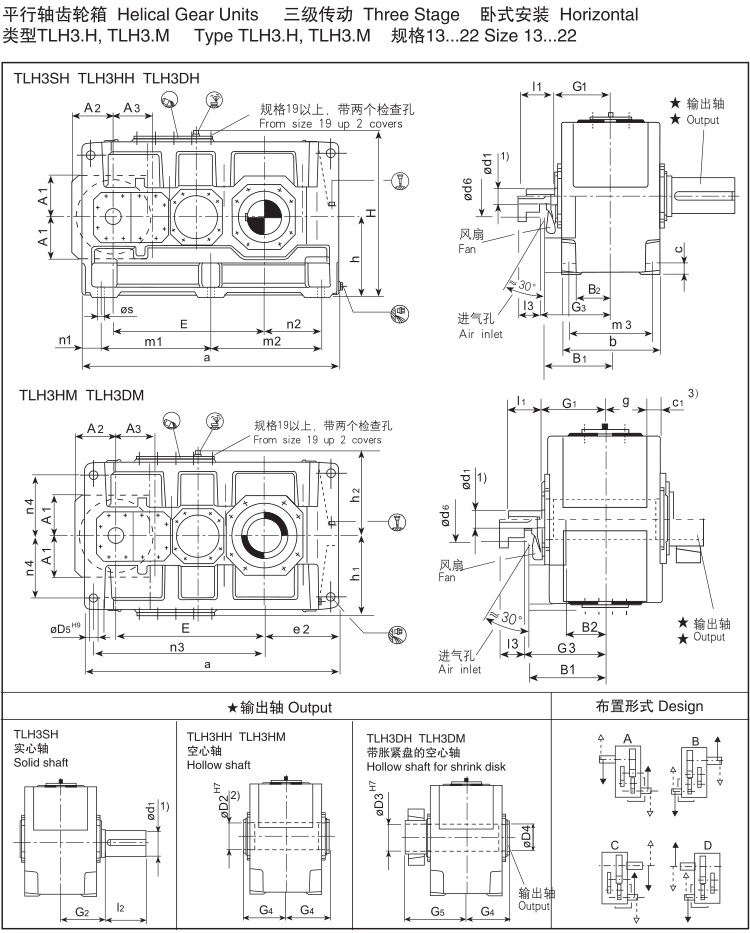 6、输出方式:带平键的实心轴、带平键的空心轴、胀紧盘联结的空心轴、花键联结的空心轴、花键联结的实心轴和法兰联结的实心轴。