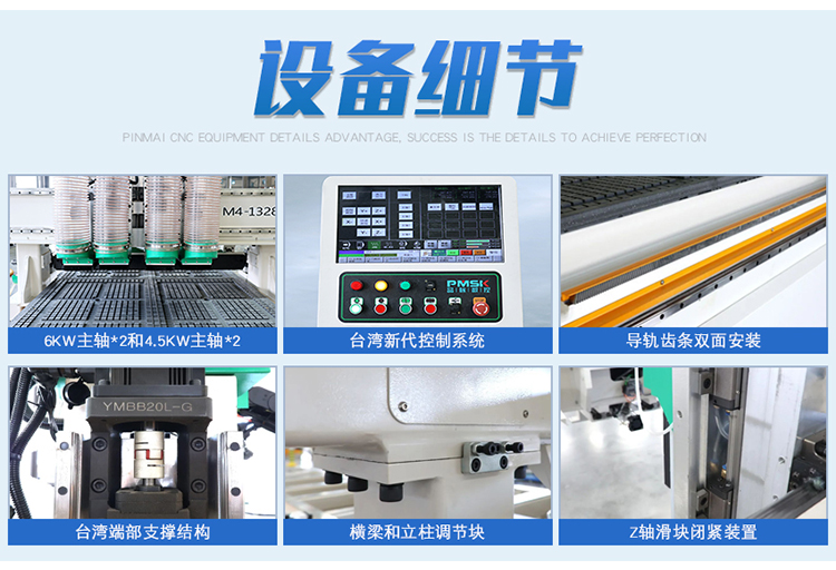 主要用于板式家具的快速钻孔、开槽与切割下料加工,可加工常见的板式家具二合一、三合一连接件的安装孔,具备加工部分种类隐形连接件的功能;操作简单,尤其适合定制家具生产加工;一般两个小功率主轴用于钻孔,两个大功率主轴兼具铣孔、开槽与切割下料,四个主轴均可携带刀具进行门板雕刻加工;本机适合多元化复杂性产品加工或多样加工,用途广泛:可一次性下料、钻孔、切割、倒边、雕刻等。