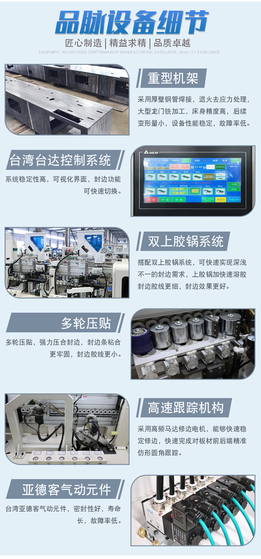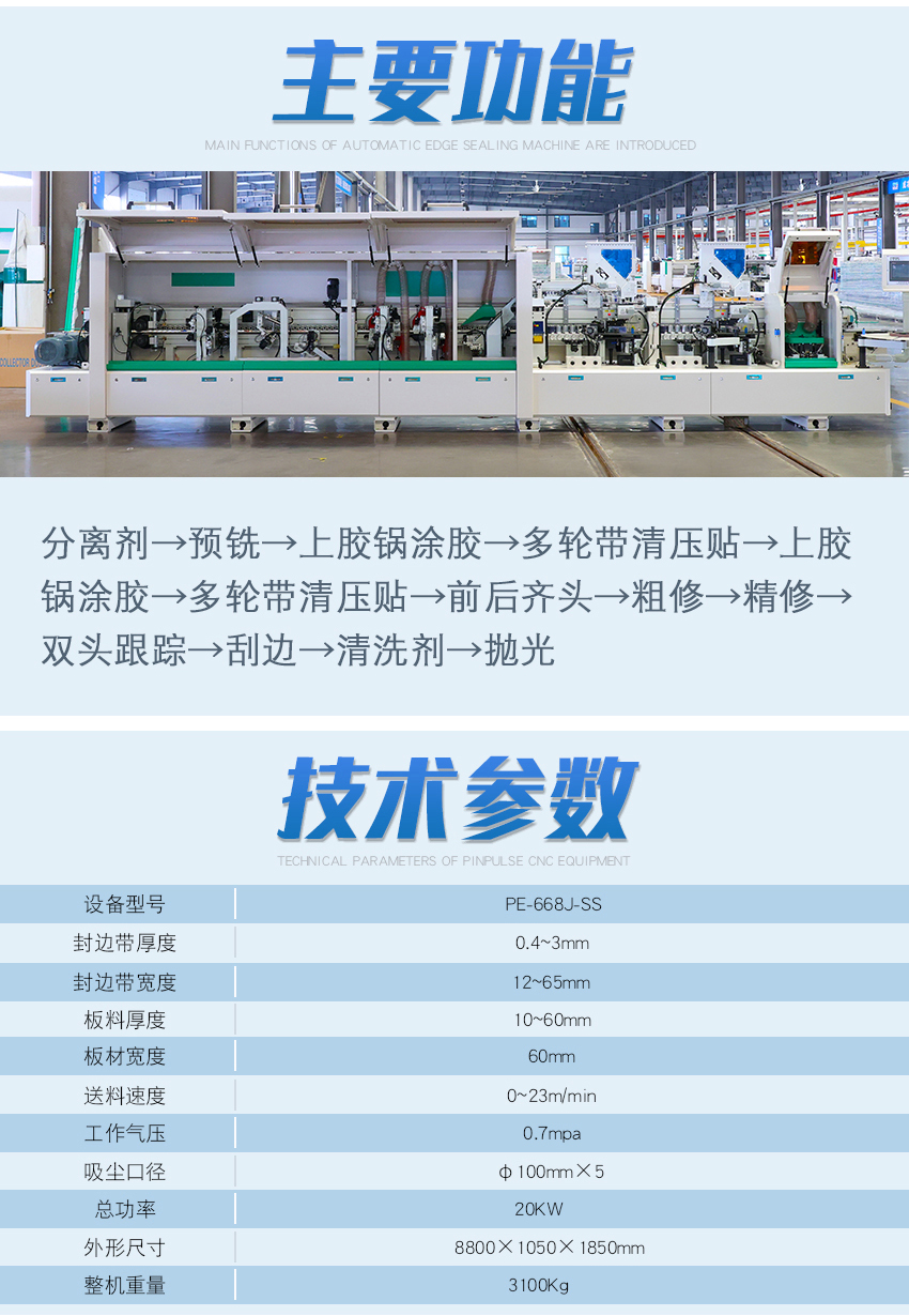 品脉数控PE-668J-SS是一款双上胶锅预铣跟踪封边机,采用重型机架,高标准装配工艺及知名品牌配件,设备故障率低,封边效果好。可配套中高端板式家具生产解决方案。