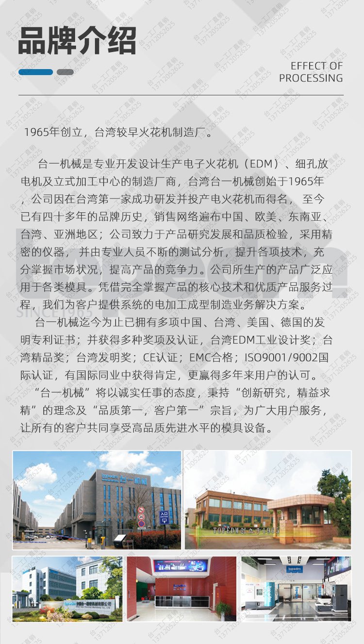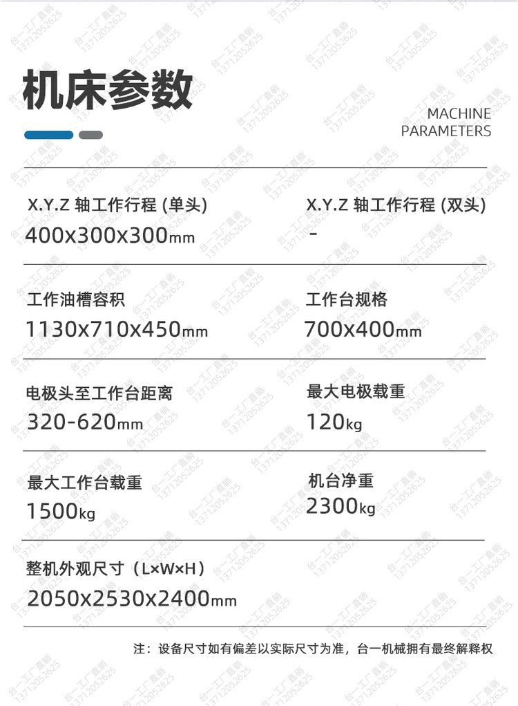 放电加工机标准配件 | 过滤网,细目磁盘,液晶显示器,刹车器,石英,工作灯,三轴滚珠丝杆,工具箱,水平调整垫,灭火器,喷油座两只,电极夹头,操作说明书 | ||