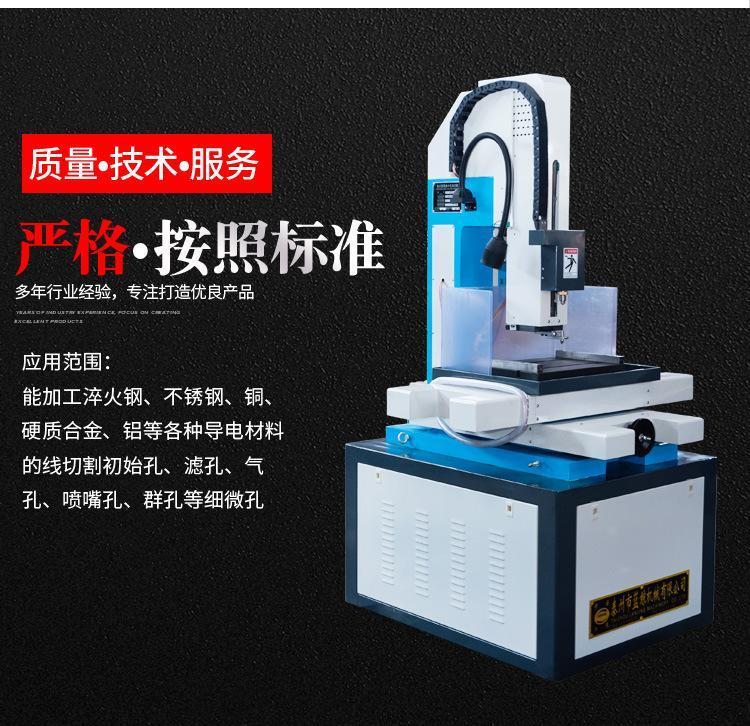 电极与金属间放电产生高温腐蚀金属达到穿孔的目的,用于加工超硬钢材、硬质合金、铜、铝及任何可导电性物质的细孔。最小可加工0.015mm的小孔,也可加工带有锥度的小孔,被广泛使用在精密模具加工中,一般被当作电火花线切割机床的配套设备,用于电火花线切割加工的穿丝孔、化纤喷丝头、喷丝板的喷丝孔、滤板、筛板的群孔、发动机叶片、缸体的散热孔、液压、气动阀体的油路、气路孔等
