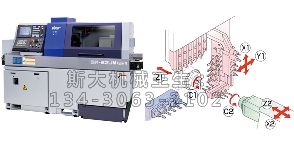 一、STAR走心机SR-32JMN属于STAR双主轴走心机,拥有X1、Y1、Z1、X2、Z2五个直线轴,适应各种复合零件精密加工。