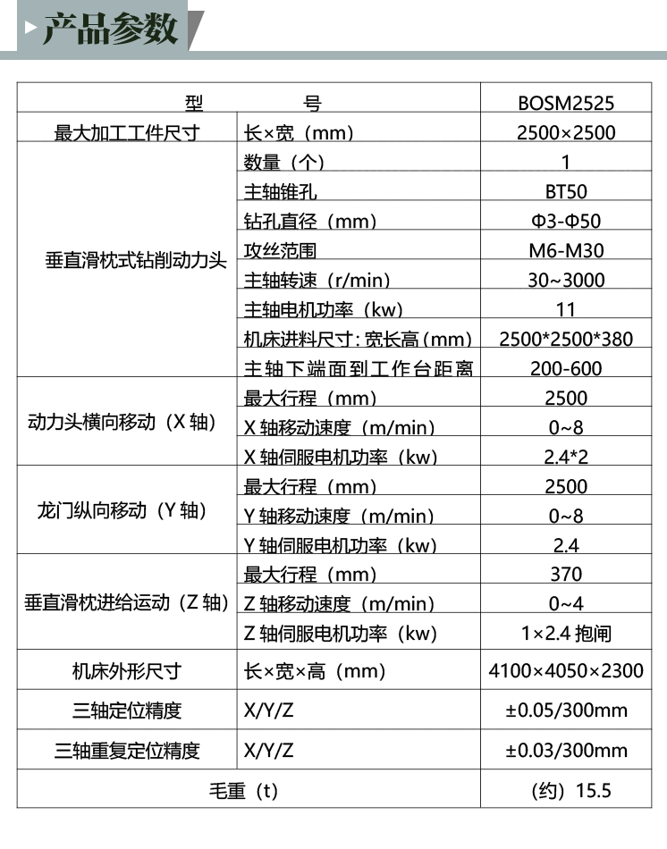 钻削动力头采用专用伺服主轴电机,通过齿形同步带减速增加扭矩带动专用精密主轴,主轴采用前三后二式五列日本角接触轴承实现无级变速,主轴配置气动换刀系统,使刀具更换快捷方便,进给为伺服电机和滚珠丝杠驱动。X、Y轴能够联动,采用半闭环控制,能够实现直线、圆弧插补功能。主轴端为BT50锥孔,配有意大利罗托福斯高速旋转接头,可使用高速U钻中心出水加工。