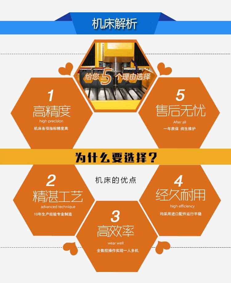 4、床身、立柱,工作台,龙门为HT250铸造结构件,支架为矩形管焊接件,加工前经高温退火,半精加工后二次退火去除应力,然后再精加工,可保证机床精度稳定,床面采整体铸铁工作台精铣出T型槽,台面数控精磨而成,保证工作台面精度。