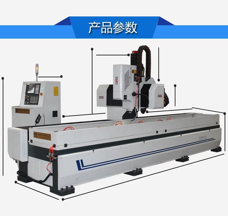 本设备主要有床身工作台、移动式龙门、移动滑鞍、钻铣削动力头、自动润滑装置及防护装置、循环冷却装置、数字控制系统、液压系统、电气系统等组成。滚动直线导轨副支撑和导向、精密丝杠副驱动,机床具有较高的定位精度和重复定位精度。