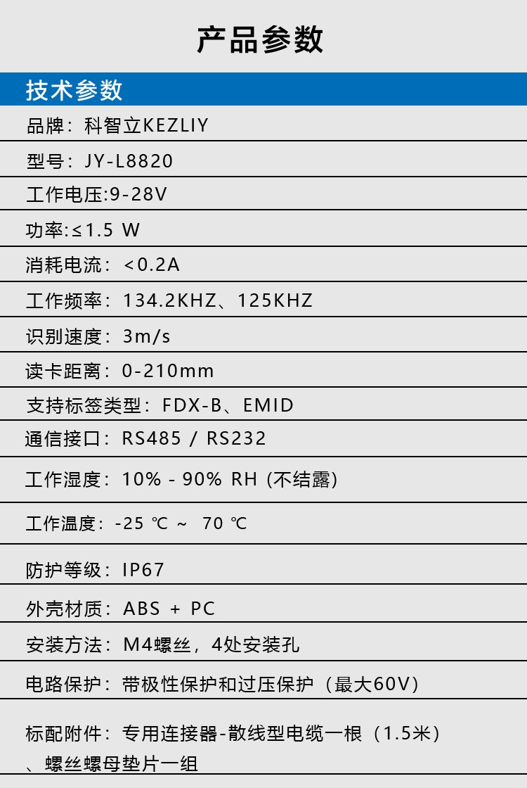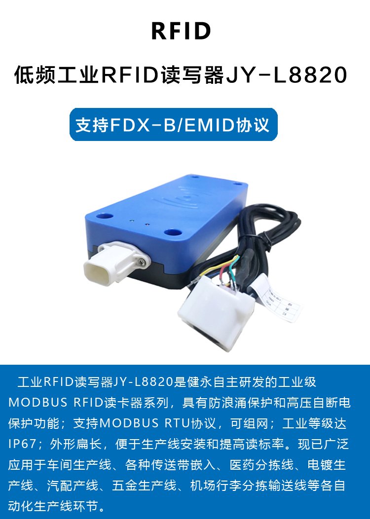 工业RFID读写器JY-L8820是健永自主研发的工业级MODBUS RFID读卡器系列,具有防浪涌保护和高压自断电保护功能;支持MODBUS RTU协议,可组网;工业等级达IP67;外形扁长,便于生产线安装和提高读标率。现已广泛应用于车间生产线、各种传送带嵌入、生产线自动化管理等环节。