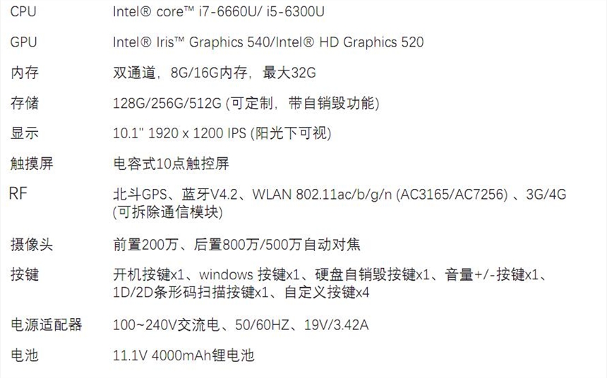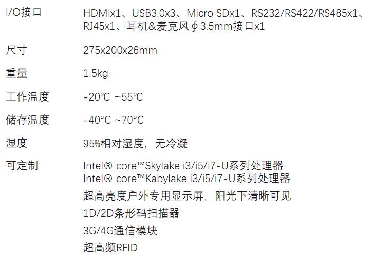 产品特点:1.支持windows7/windows10; 2.支持USB3.0接口; 3.支持RFID; 4.支持GPS/北斗定位; 5.三防IP65防护等级; 6.支持高强度玻璃触摸屏; |