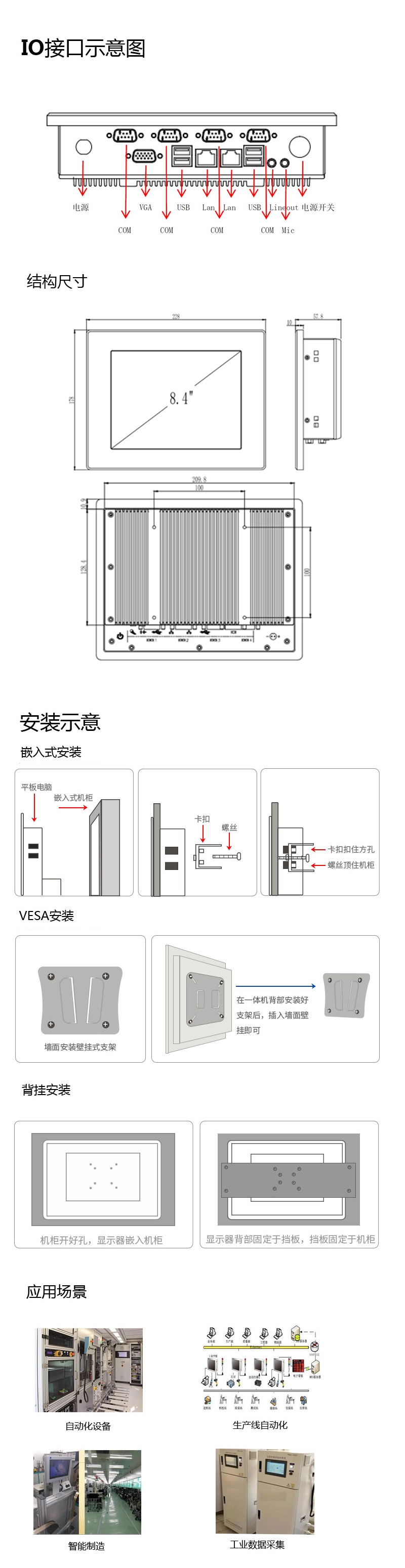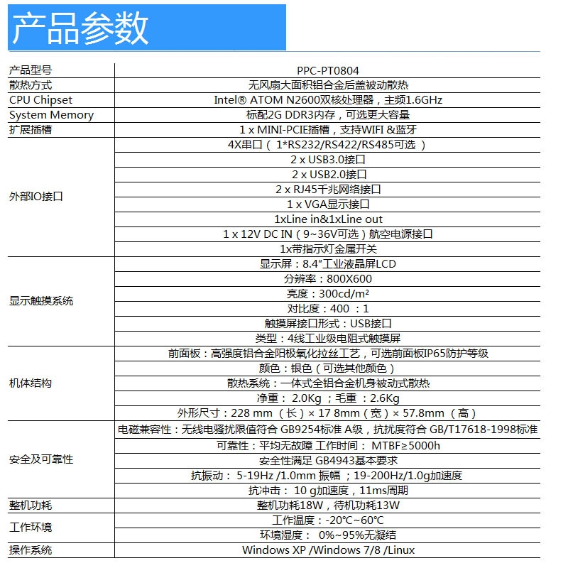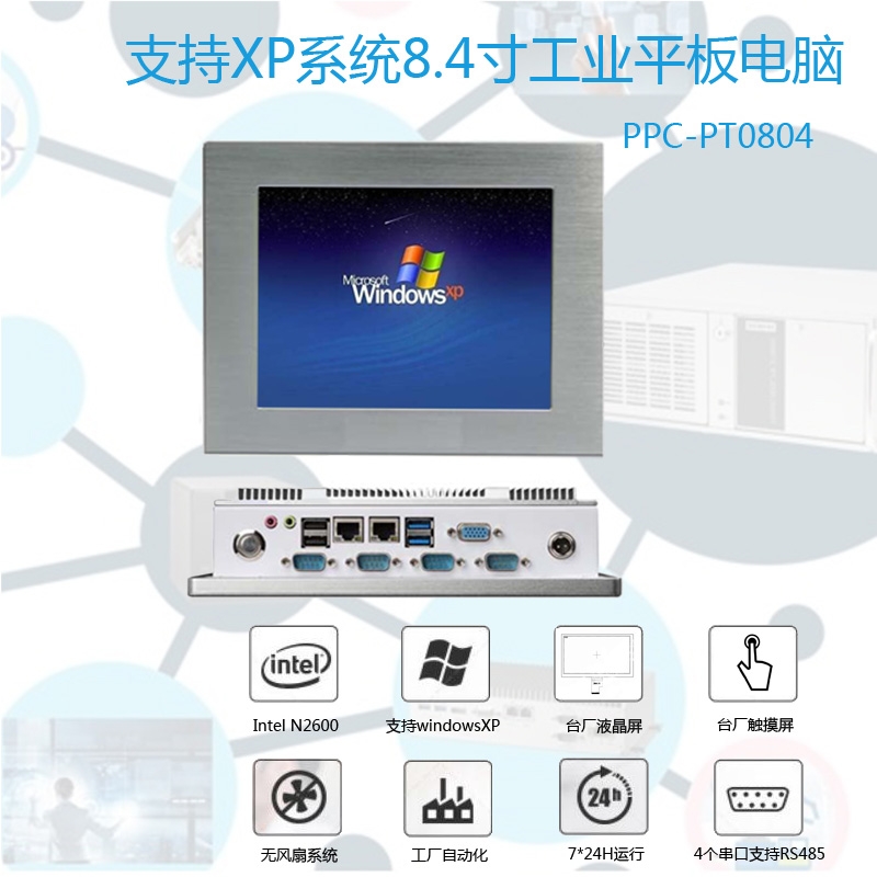 PPC-PT0804是一款支持windowsXP操作系统的工业平板电脑,该平板电脑采用工业8.4寸液晶屏,支持电阻式触摸屏,前面板支持IP65防尘放水。PPC-PT0804设计为工业控制,数据采集,生产线显示控制,机床控制系统工业平板电脑,采用Intel N2600 CPU开发,超低功耗,支持WindowsXP/7等操作系统。PPC-PT0804设计了4个串口,可选支持RS485接口,GPIO接口,4个USB接口,2个千兆网卡接口,可选9~36V DC输入。产品在橡胶机械、太阳能光伏、车载控制以及普通工业自动化(如造纸、环保等)行业均有应用。