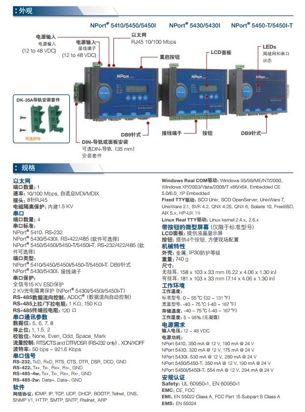 NPort 5400系列的基本功能是把您现有的串口设备联让您可以轻松方便的将串口设备连接到以太网络。不但保证您现有的硬件资源,更保证您未来的网络扩充的可能性。另外,NPort 5400系列可以轻松的在串口和以太网络之间进行双向的资料传输,让您可以同时达到集中管理串口设备,和在网络中分散管理主机的目的。