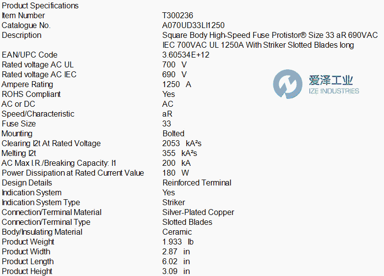 FERRAZ SHAWMUT熔断器A070UD33LI1250 T300236技术参数介绍