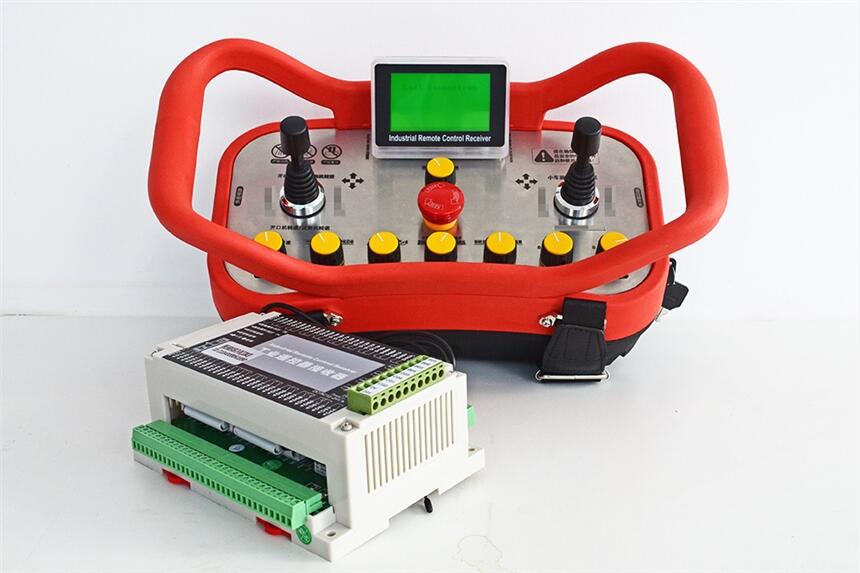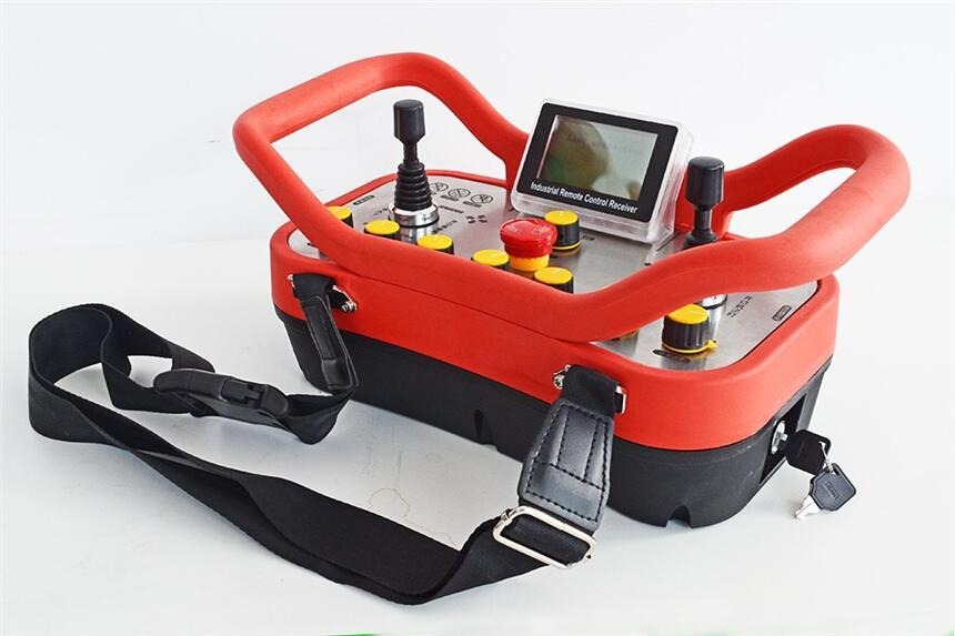 遥控器手持端布局及功能执行:启动 急停,1个四向五速摇杆,1个四方向模拟量比例杆或1个两方向模拟量比例杆,8个选择开关,1号摇杆四方五速摇杆用于控制塔吊的吊钩上下五速以及吊钩前后行走3速,2号比例杆用于控制塔吊吊臂的左旋、右旋模拟量输出控制,模拟量控制输出可调节0-10V、或0-5V,4-20mA。手持端采用箱体式,有背带,可悬挂于胸前操作,手握感良好,可按需定做文字标识或铭牌。开关量摇杆四方向五速,可实现前后左右四个方向动作,每个方向可实现5速控制,每个方向对应5路继电器输出,4个方向可输出开关量20路启动旋钮控制遥控系统整机启动,急停用于发射机和接收机及被控设备的总电源的紧急断开;双摇杆可协同动作,也可独立动作执行,功能多样化,满足多种复杂工业级无线控制需求。