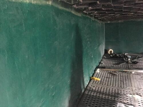 4、在玻璃鳞片底漆干后进行鳞片胶泥施工。鳞片胶泥的施工宜采用抹涂和滚相结合,一次抹厚度1mm左右,一般分两次完成,后一道工序在前一层胶泥干后在进行。