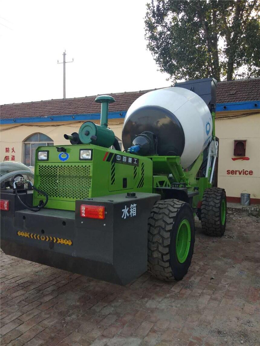 除了自上料的特点外,中首重工的这款水泥搅拌车的整车构造还和普通的水泥搅拌车不一样,它采用了4轮驱动底盘,发动机后置的设计,驾驶室非常小,被单独的放在了整车的左侧, 显得比较特别。