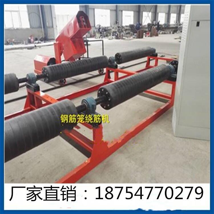 胶辊旋转带动钢筋笼转动,按图纸设计间距,配合小车移动缠绕箍筋成型。