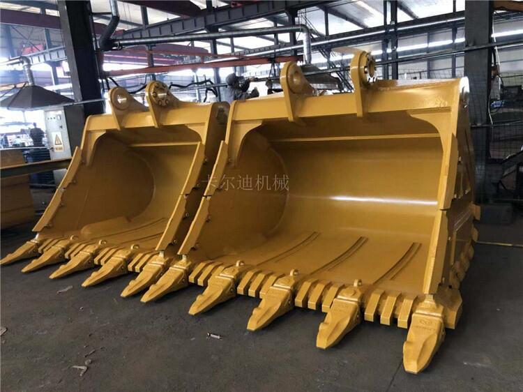 岩石斗是挖掘机铲斗按材质分类的其中一种,挖掘机铲斗按材质分为标准斗、加强斗、岩石斗、碎石斗,岩石斗等。标准斗材料选用国产优质高强度结构钢16Mn,适用于一般黏土、松土的挖掘和沙、土、砾石的装载等较轻作业环境。加强斗的易损部位齿座板和侧刃板材料选用国产优质高强度耐磨钢NM360,适用于挖掘混有较软碎石的硬土或碎石、砾石的装载等重载作业。岩石斗的齿座板和侧刃板材料选用高强度合金板,适用于挖掘混有较硬碎石的硬土、次坚石、风化石或坚石、爆破后的矿石的装载等重载作业环境。