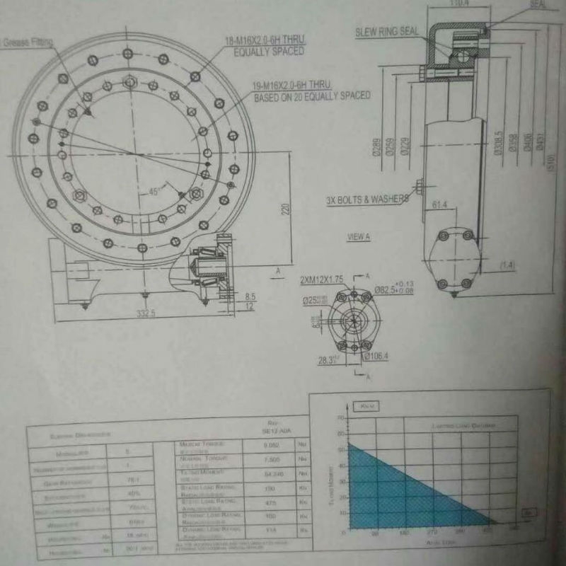 双排球式转盘轴承有三个座圈,钢球和隔离块可直接排入上下滚道,根据受力状况,安排了上下两排直径不同的钢球。这种开式装配非常方便,上下圆弧滚道的承载角都为90,能承受很大的轴向力和倾翻力矩。当径向力大于0.1倍的轴向力时,滚道须特殊设计。双排异径球式回转支承的轴向、径向尺寸都比较大,结构紧固。特别适用于要求中等以上直径的塔式起重机,汽车起重机等装卸机械上。