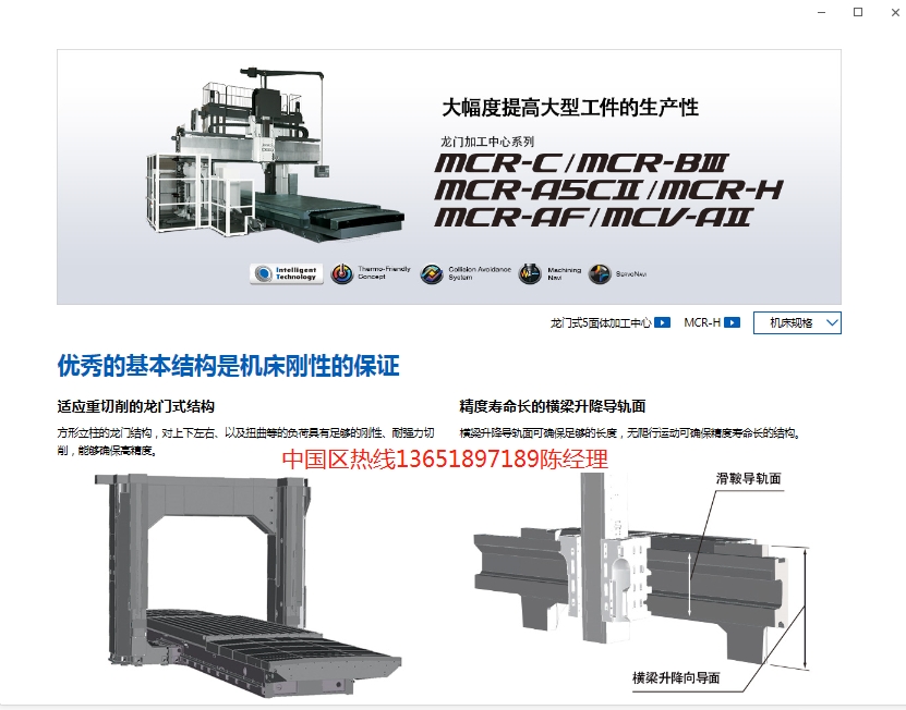 方形立柱的龙门结构,对上下左右、以及扭曲等的负荷具有足够的刚性、耐强力切削,能够确保高精度。
