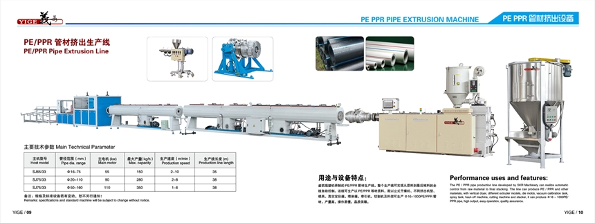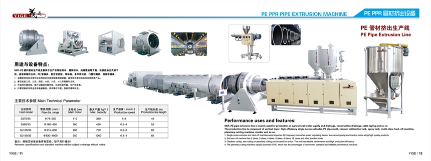PE大口径挤出设备主要用于生产农用排水管,建筑排水,线缆敷设等方面。该机由立式烘干机,高效单螺杆主机,PE模具,真空定径箱,喷淋箱,多爪牵引机,料架等组成。