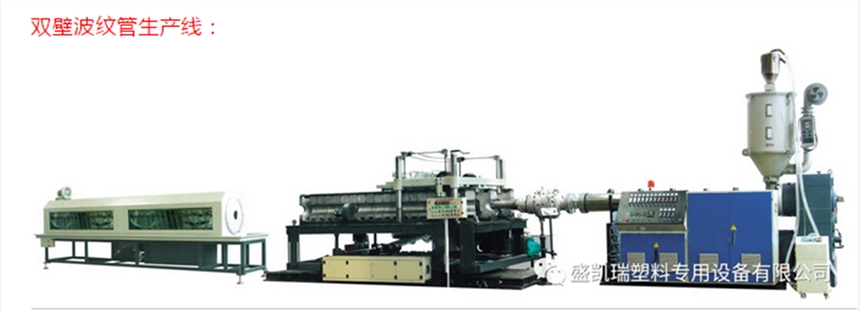 HDPE/PP双壁波纹管为立式或卧式结构。成套机组配置高效单螺杆挤出机、层流分配器、双流道螺旋复合挤出模具、立式或卧式成型机、喷淋冷却装置和单、双刀行星环型切割机及存料台。