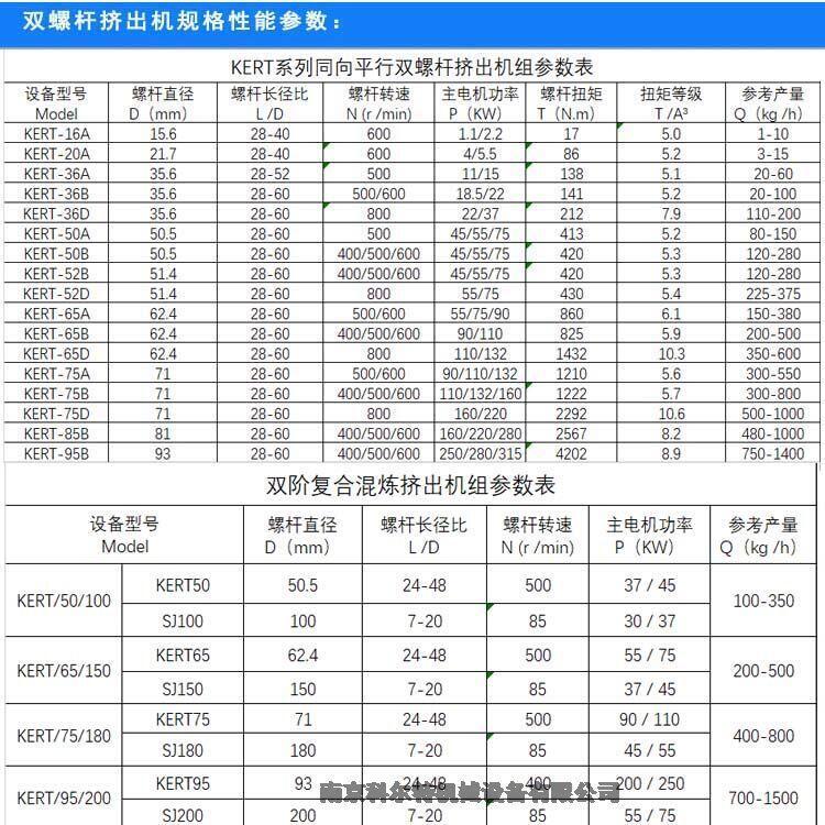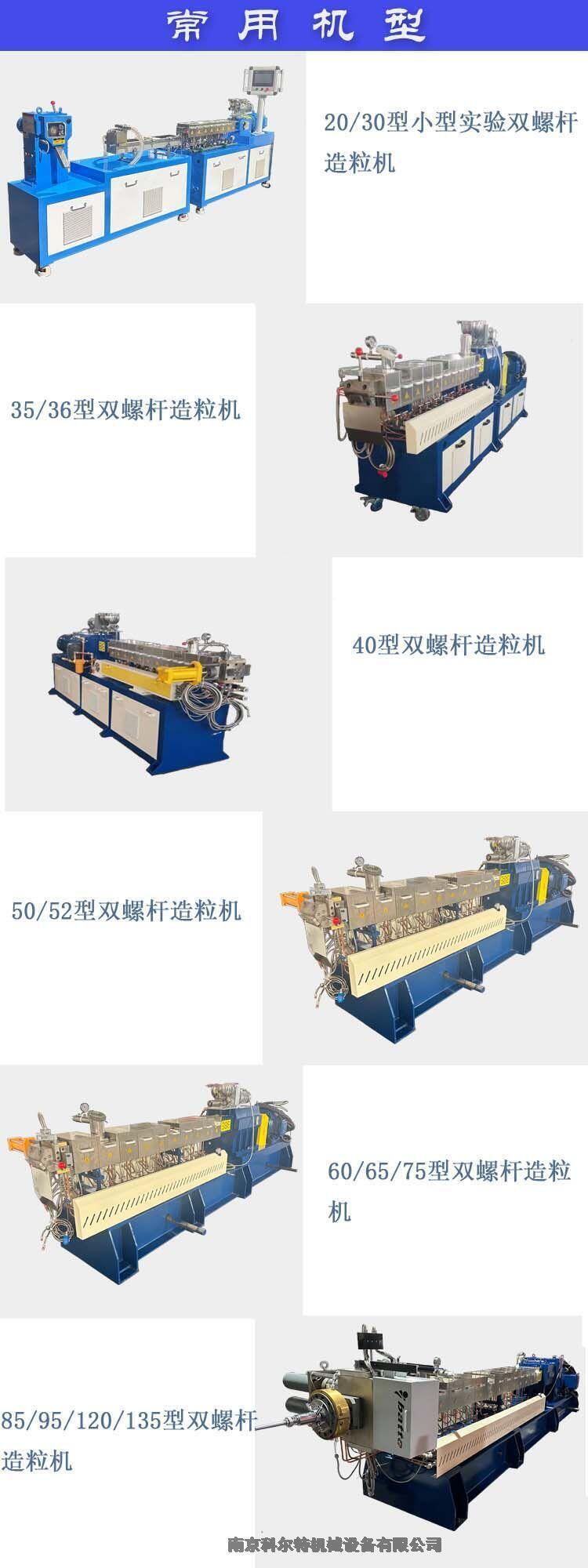 20双螺杆小型实验机, 30双螺杆挤出造粒机,36双螺杆挤出造粒机,35双螺杆挤出造粒机,50双螺杆挤出造粒机,52双螺杆挤出造粒机,65双螺杆挤出造粒机,75双螺杆挤出造粒机,85双螺杆挤出造粒机,95双螺杆挤出造粒机,120机双螺杆造粒机,135双螺杆挤出机