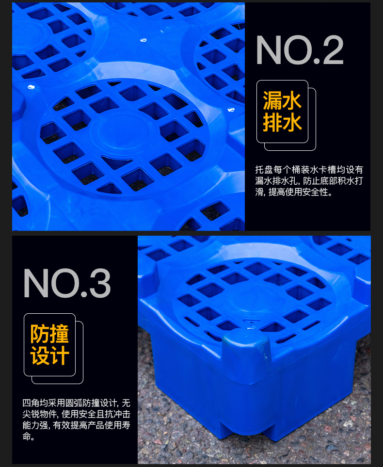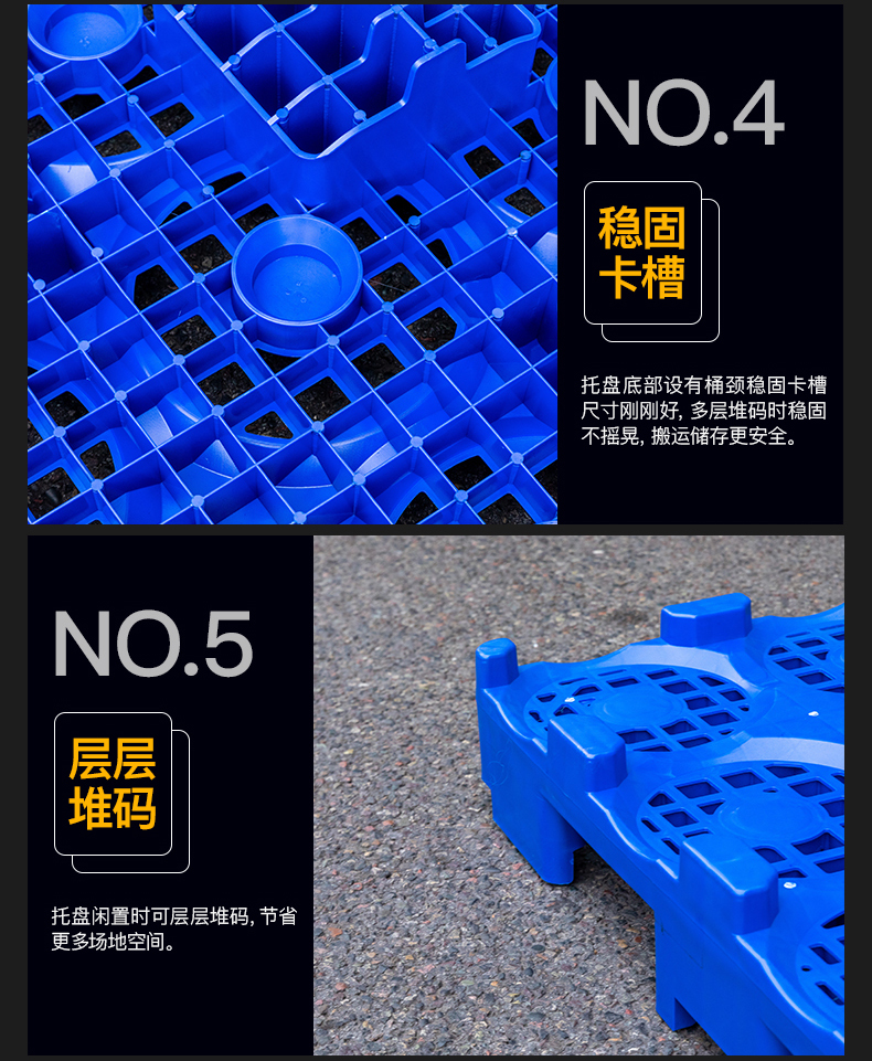 桶装水托盘不同于仓储托盘,桶装水托盘是饮用水行业专用的塑料托盘产品,尺寸通常为1080*1080*180mm,单层可放置16桶5加仑桶装水,桶装水托盘采用优质刚性佳、耐热的优质PP及耐冲击、耐低温、耐酸碱侵蚀的优质HDPE(高密度聚乙烯)为原材料一次注塑而成型。塑料桶装水托盘的应用,大幅提高了土地利用率和装载效率,节省人工人力,避免了桶装水在装卸过程中产生的货损及污损,同时,托盘标准化应用还有以下好处: