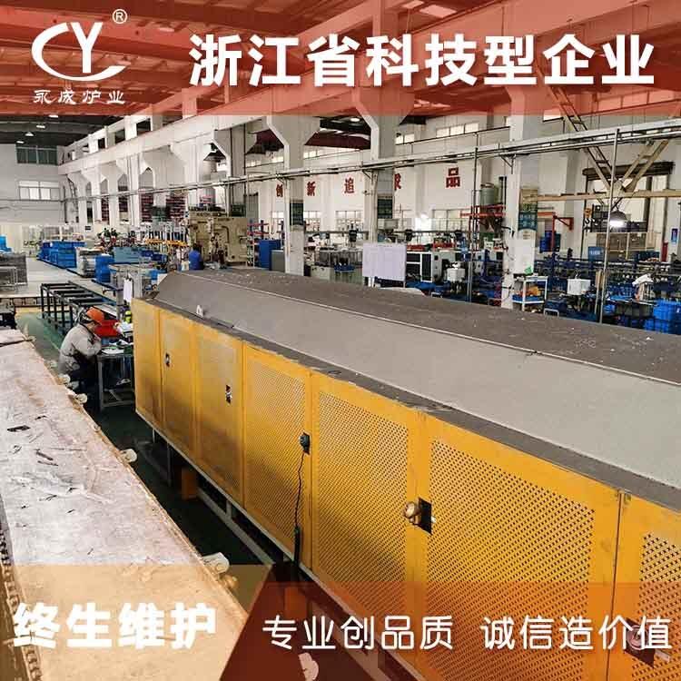 按功能细分包括前辊道料台、前换气室、前预热区、加热炉、缓冷区、冷却区、后换气室后辊道料系统、计算机控制系统、电气控制系统、保护气氛装置。上料和卸料全部通过红外线传感器控制气缸自动进出料,长兴YC160kw连续式不锈钢管光亮退火炉不需要人工推料,大大减少了劳动强度,提高了劳动效率。各区段之间设置分区隔热墙,减少了区段与区段之间的温度影响,提高了控温精度,降低了能耗。