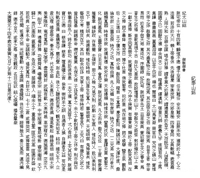 高宗稽古,德施周溥,茫茫九夷,削平一鼓。礼备封禅,功齐舜禹,岩岩岱宗,衍我神主。