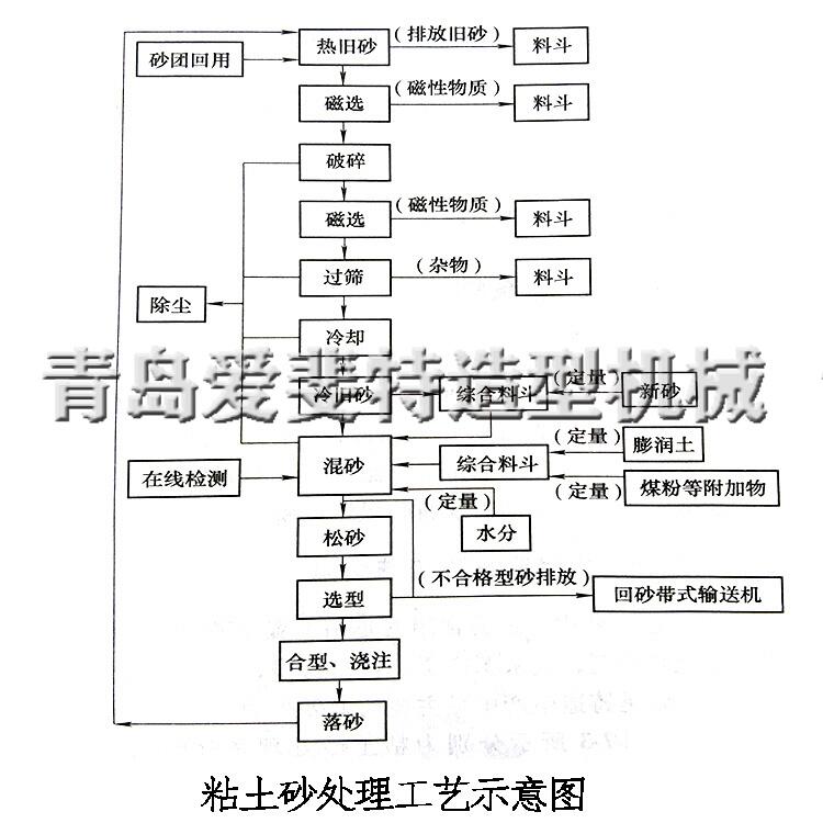 铸件分离→皮带机→一次磁选→砂温测定→加水→二次磁选→六角筛→筛分→皮带→砂温测定→加水沸腾冷却→皮带→斗提机→皮带→储砂罐→震动给料机→新旧砂称量→砂温测定→辅料及水称量混料→湿压强度与紧实率在线测定→松砂→皮带→造型储砂罐→实验室取样→造型