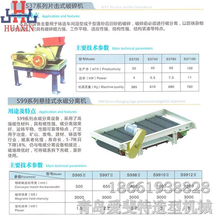 在高效砂处理的自动造型线中对型砂内铁磁性异物的含量有严格的要求。采用两次磁选,分别为悬挂式磁选机和永磁皮带头轮,使砂层表面与内部铁磁物彻底清理。