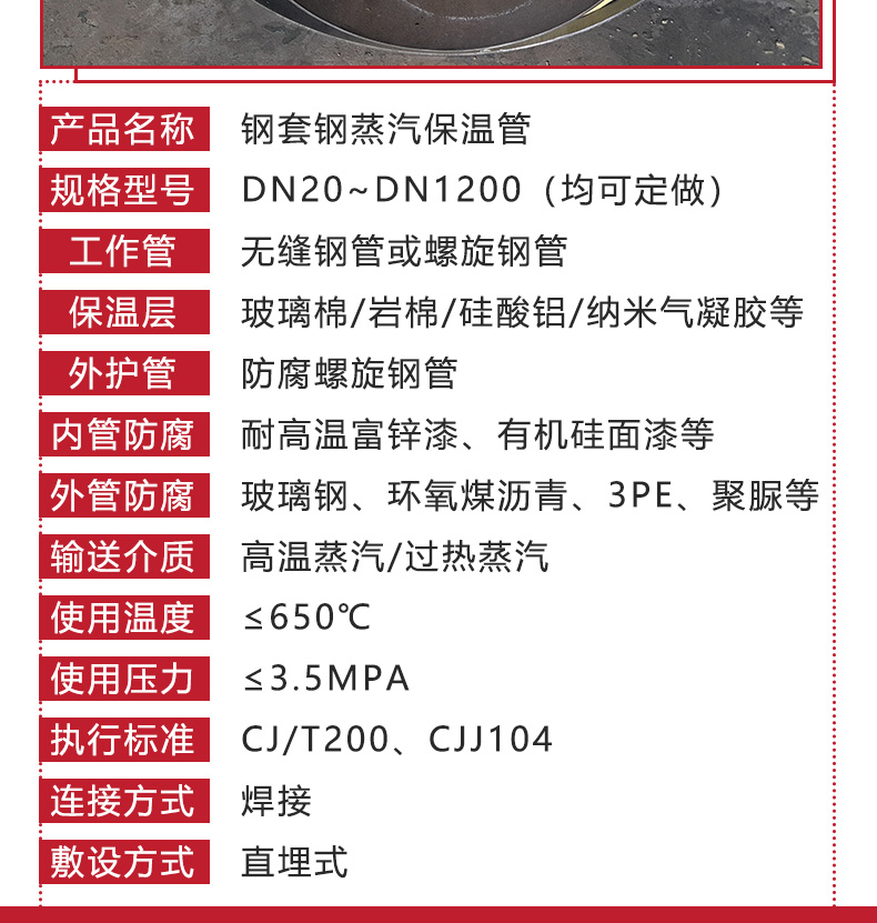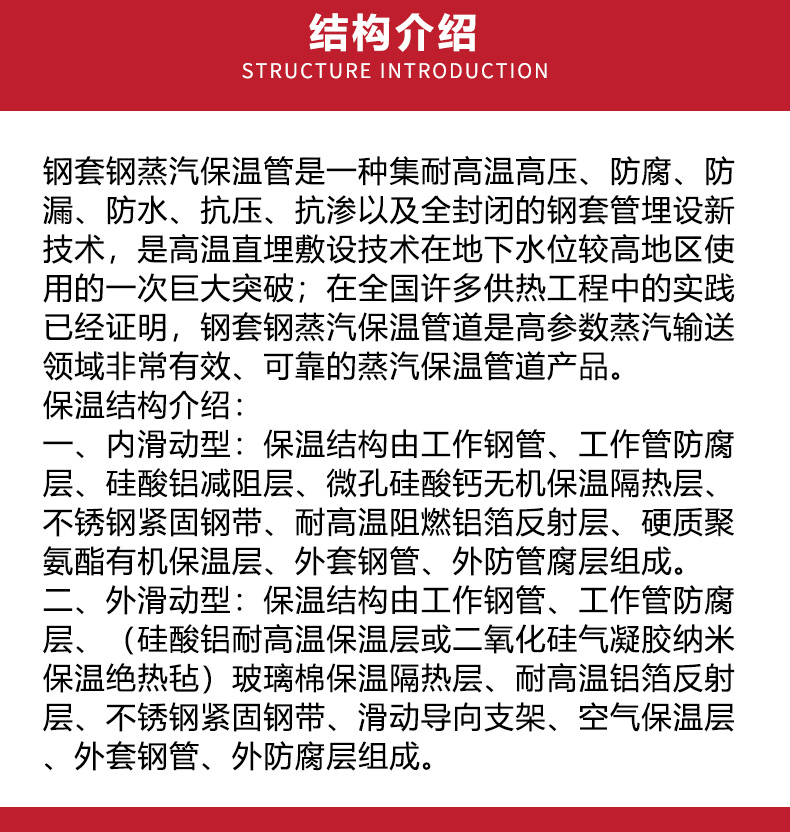 产品表面描述 | 工作钢管 耐高温复合保温层 钢制外护管 防腐层 | ||