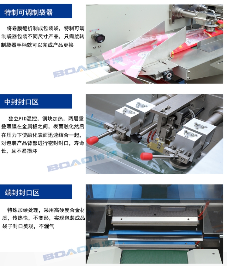 佛山市博澳包装机械有限公司是枕式包装机、伺服包装机、食品包装机、五金包装机、口罩包装机、凝胶管包装机、说明书包装机、数据线包装机、钢管包装机、糕点包装机等产品专业生产加工的公司,拥有完整、科学的质量管理体系。佛山市博澳包装机械有限公司的诚信、实力和产品质量获得业界的认可。欢迎各界朋友莅临参观、指导和业务洽谈。博澳在成长中腾飞稳健发展,创造伺服包装机产业发展史上的传奇,公司奉行“以质量求生存,以服务求发展”的经营理念,科学进步为导向,科技人才为根本,开创了各行业包装行业的全新格局
