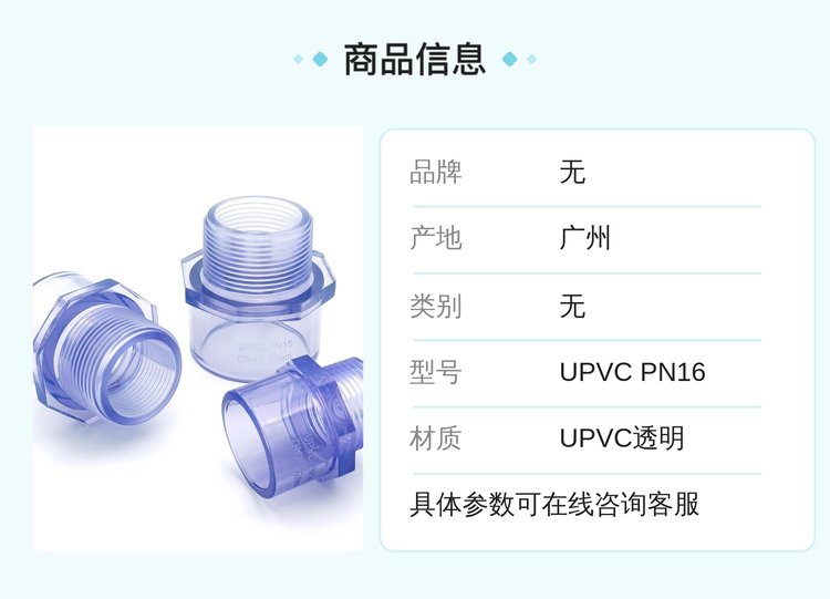 UPVC透明外牙接头DN40/50 耐腐蚀强 环保安全 品牌 | 其他 | ||