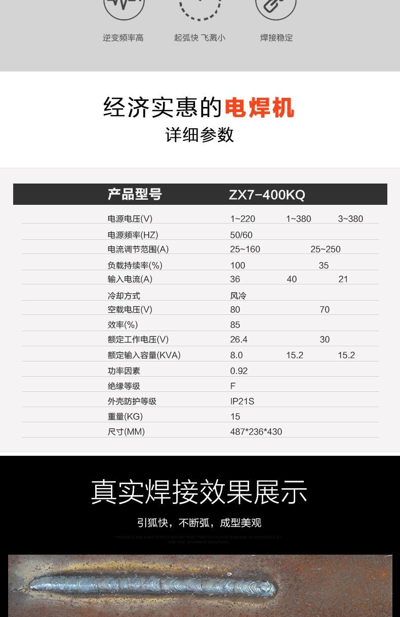 单管IGBT,高频逆变式直流弧焊电源,高效节能,适用于酸性、碱性、不锈钢、铸铁焊条等焊接。