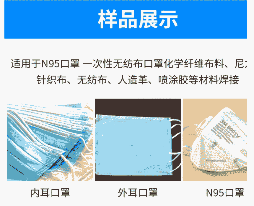 适用于各种平面口罩无纺布口罩,普通口罩,医用口罩,PM2.5, KN95口罩等,可以对口罩多层材料进行无针缝合,替代缝纫,具有连续无限长的焊接功能,焊点牢固、美观,工作效率高。