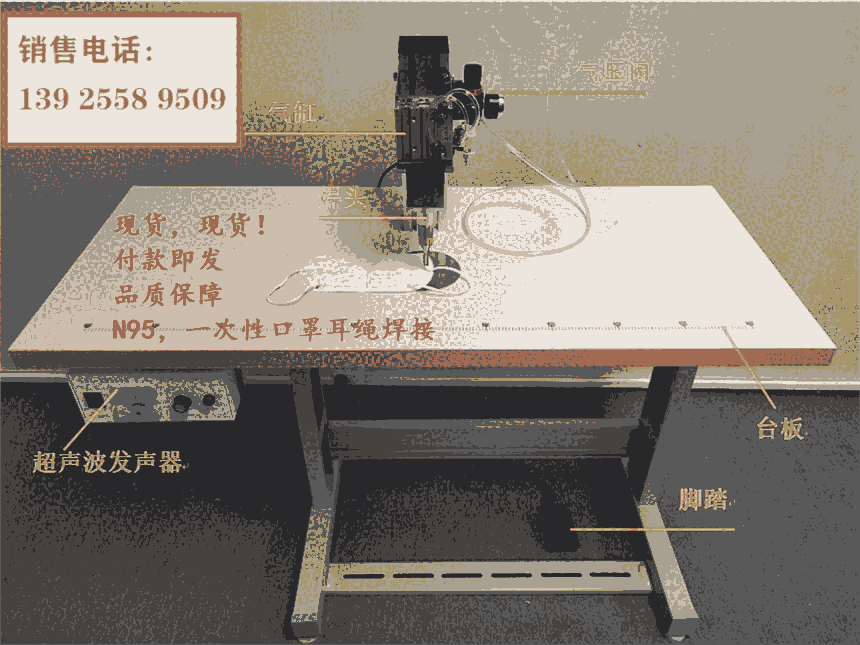 此款为手持式超声波点焊机,采用脚踏方式配合超声波操作,只需一位员工,一台机器即可独立完成耳绳的焊接。操作简便,两秒焊接,可选择方头或者圆头焊头。