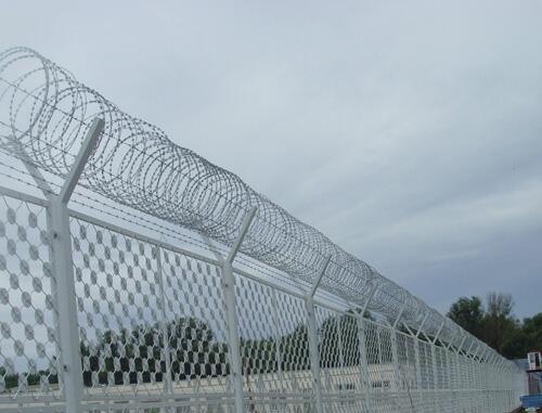刀片刺网隔离网-安全隔离网-铁丝防护网又称作安全防御护网,是由安全立柱(顶部可带V型),加强型焊接片网,安全防盗连接件和刀片刺笼组成,强度和安全防御级别很高。近年来,被广泛应用在军事基地等高安全场所。表面采用电镀、热镀、喷塑、浸塑等防腐形式,具有很好的抗老化、抗晒、耐候等特点。这种安全围网造型美观、花色多样,既起到围栏作用,又起到美化作用。由于具有安全性高、防攀爬能力好,网片连接方式采用特制SBS紧扣件,有效防止人为的破坏性拆卸,横向四道折弯加强筋或四周焊接方管边框,使网面强度显著增加。
