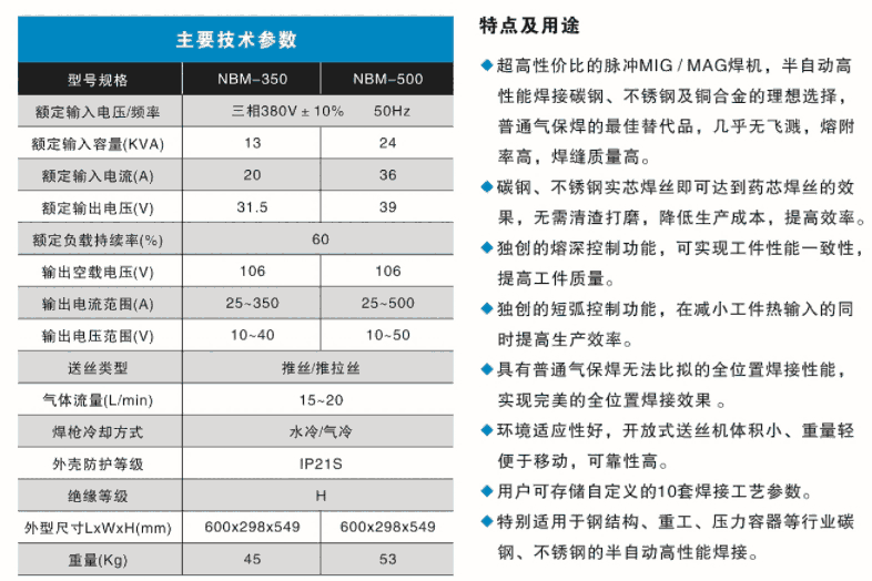 ?超高性价比的脉冲MIG/MAG焊机,半自动高 性能焊接碳钢、不锈钢及铜合金的理想选择, 普通气保焊的最佳替代品,几乎无飞溅,熔附 率高,焊缝质量高。
