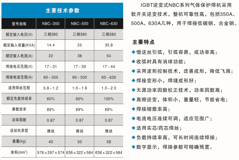 IGBT逆变式NBC系列气体保护焊机采用 软开关逆变技术,整机可靠性高,包括350A、 500A、630A几种,用于焊接低碳钢、合金钢。