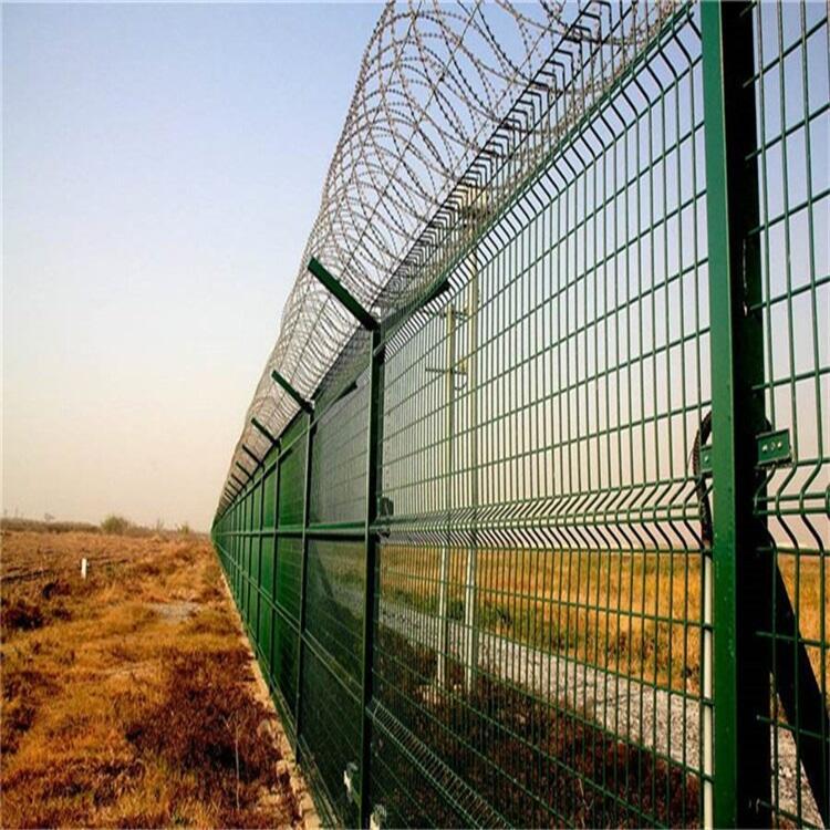 机场防护隔离网是由折弯网片加上V型支架立柱加强型焊接片网连接件组成的强度和安全防御性级别很高的一种产品,因为又被称为Y型安全防御护网、Y型金属网格围栏。机场钢丝网围界表面防腐处理采用电镀、热镀、喷塑、浸塑等形式,具有很好的抗老化、抗晒、耐腐蚀等特点。