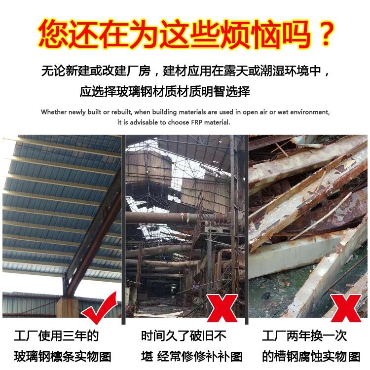 玻璃钢防腐檩条是以不饱和聚酯树脂,无碱玻璃纤维纱、加工助剂为主要原材料,采用特殊配方,经科学的生产工艺流程加工制成。防腐檩条设计合理,原材料特殊,使产品具备钢材的强度,并且从根本上解决了金属钢材易腐蚀的弱点。使具有强度高,防腐性好,安装效率高和可靠性长久等优点,而成为大、中厂房工程安装材料选择。特别适用临海建筑、轧钢厂、冶炼厂、化肥厂、铝业氧化车间、海产养殖等高酸碱腐蚀环境中的工业建筑。