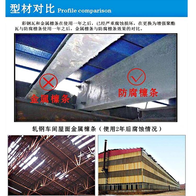 防腐檩条选用优质热固性树脂、玻璃纤维系统制造而成,不同于一般的热塑性塑料,添加抗紫外线剂和采用聚酯纤维毡可以获得抗老化效果。