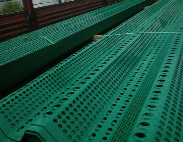 煤场、码头防尘网安装时可在下部设置1.2—1.5米的挡土砖墙,以防止雨雪后煤泥水外溢。挡风板与立杆的连接采用螺钉和压板固定。挡风抑尘扳的具体尺寸、弯曲度、开孔率应根据堆场的实际情况进行设计。