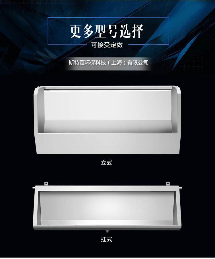 上海斯特嘉不绣钢小便槽BXG系列,其样式已被国内大部分厂家确定为不锈钢小便槽的采购标准,有多样款式供选择【立式,挂壁式,踏板款】等。我厂生产的不锈钢小便槽美观大方,豪华气派时尚,制作上精益求精,保证高品位,高质量,小到螺丝转轴选材,焊接等局严格把关,精心制作。
