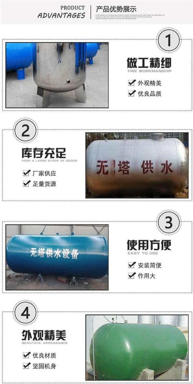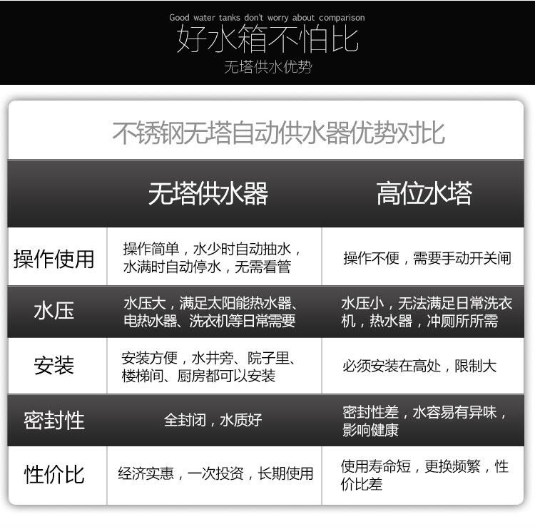 它的主要优点是美观卫生,无垢无味、卫生、不生锈、没有瓷现象,经久耐用寿长。无塔供水器采用质的不锈钢钢板,先进的无缝焊接技术加工而成的。秀的牌对杜使用不锈铁作为水箱原材料,我们在板材选用上严格把关,只要水质没有问题,就不会有生锈现象,广大用户可放心使用。只有质的不锈钢无塔供水器才是理想的供水器。