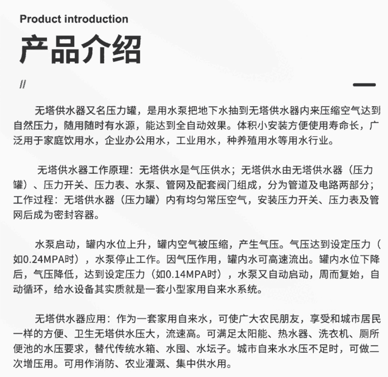 无塔供水 水泵保护:安装在室内,既防盗又防潮,增加使用寿。