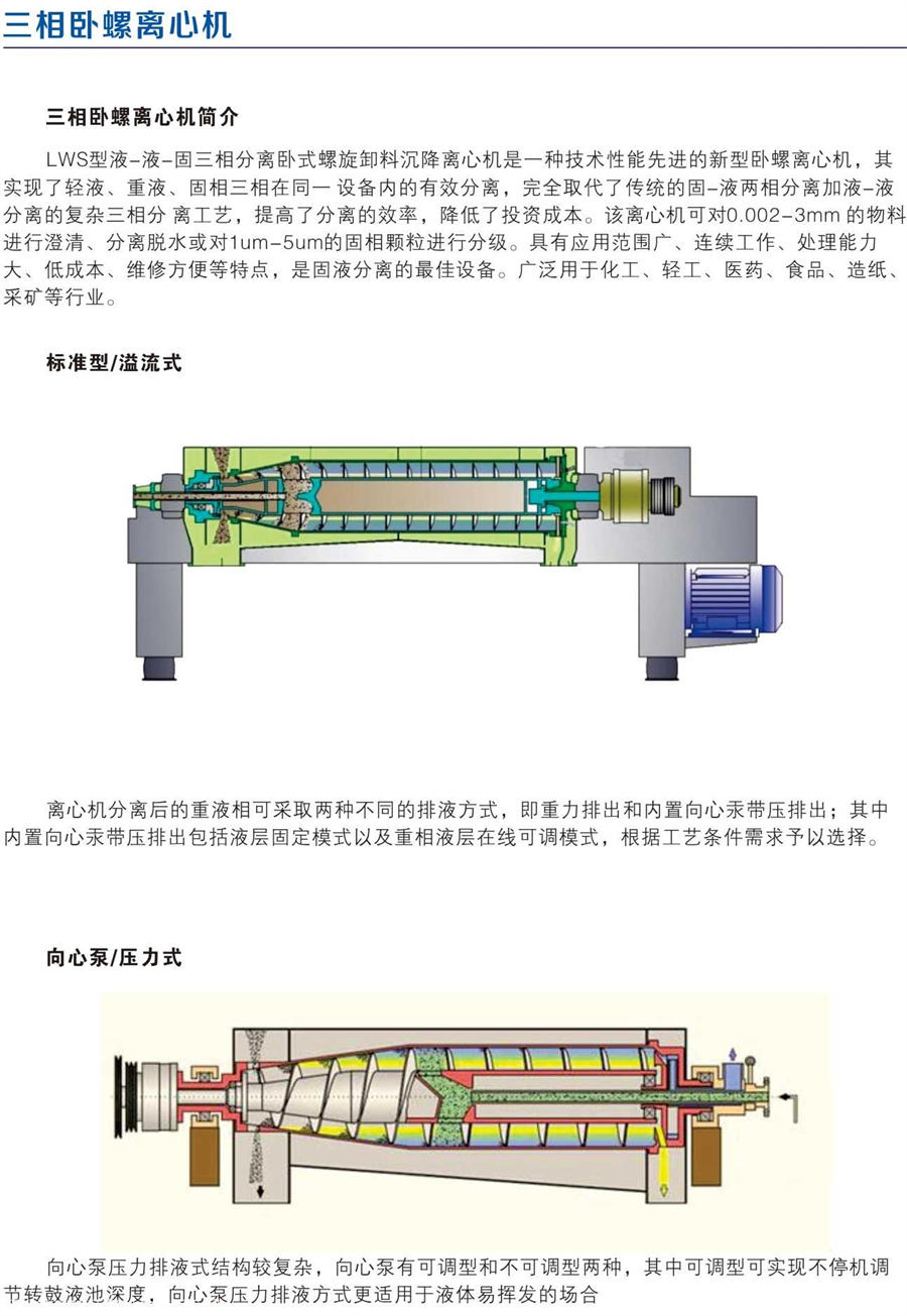 三相卧式螺旋卸料沉降离心机工作原理:离心机由两个转子组成,一个叫转鼓,另一个转子是螺旋卸料器(简称螺旋)。转鼓高速旋转时,转鼓内浆料随转鼓一同旋转,并受离心力作用,此离心力比重力大许多倍,这样固体颗粒就会从液体中分离出来,从离心机转鼓轴心,沉降到转鼓内壁上,位于转鼓内的螺旋卸料器以低于转鼓的转速转动并将沉积的固体颗粒推到出渣口,外转鼓与螺旋卸料器的差转速(影响推渣速度)取决于差速器的传动比及其转速。而重轻两相液体有离心力分成两层。。