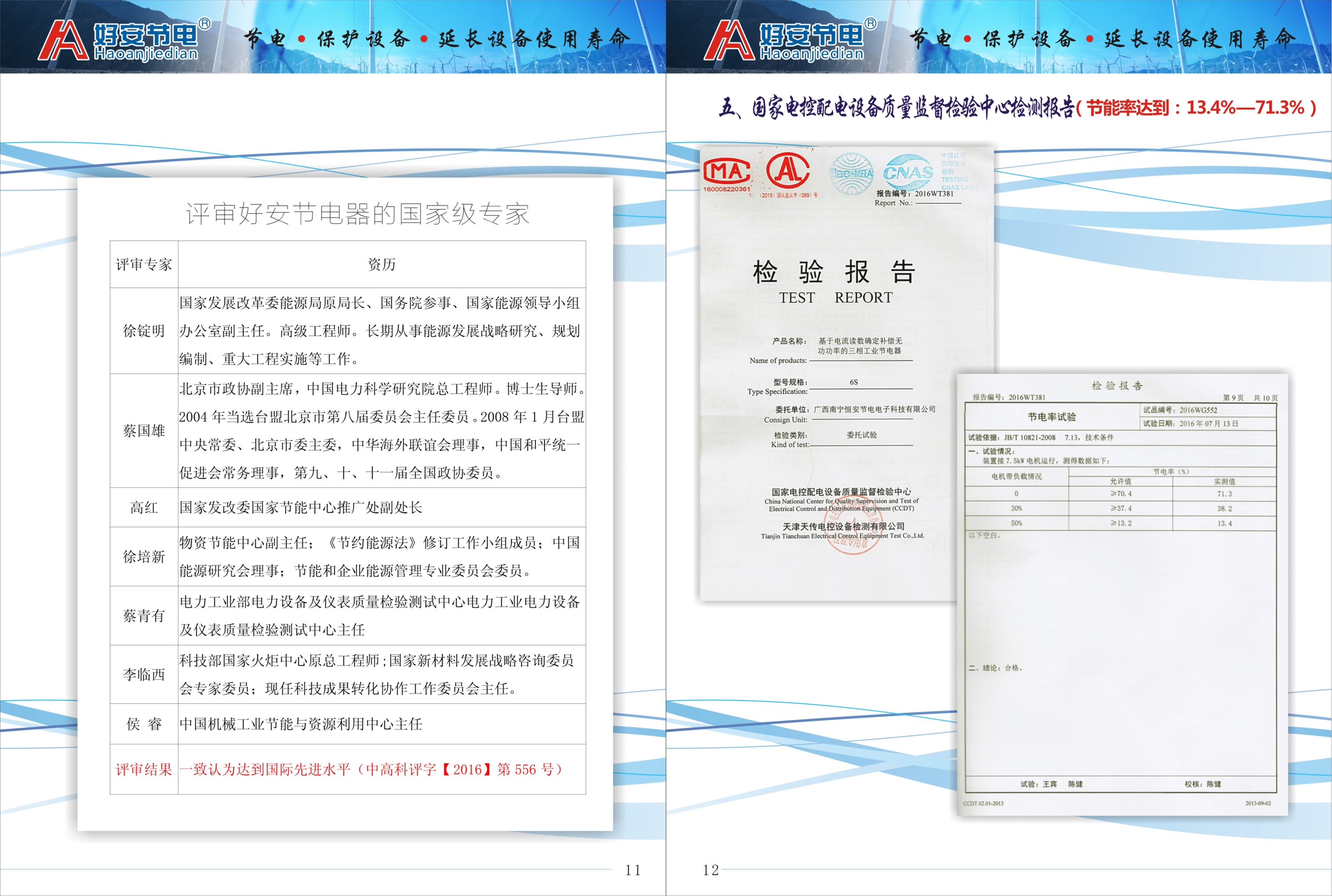 2016年7月,通过国家权威的检验机构-国家电控配电设备质量监督检验中心的检测,节电率达到13.4%-71.3%(报告编号:【2016】WT381),这是我国国内唯一能通过国家电控配电质量监督检验中心检验出这个高水平的节电器产品,它大大超越在世界有影响力的欧洲ABB节电产品(10%-30%)。