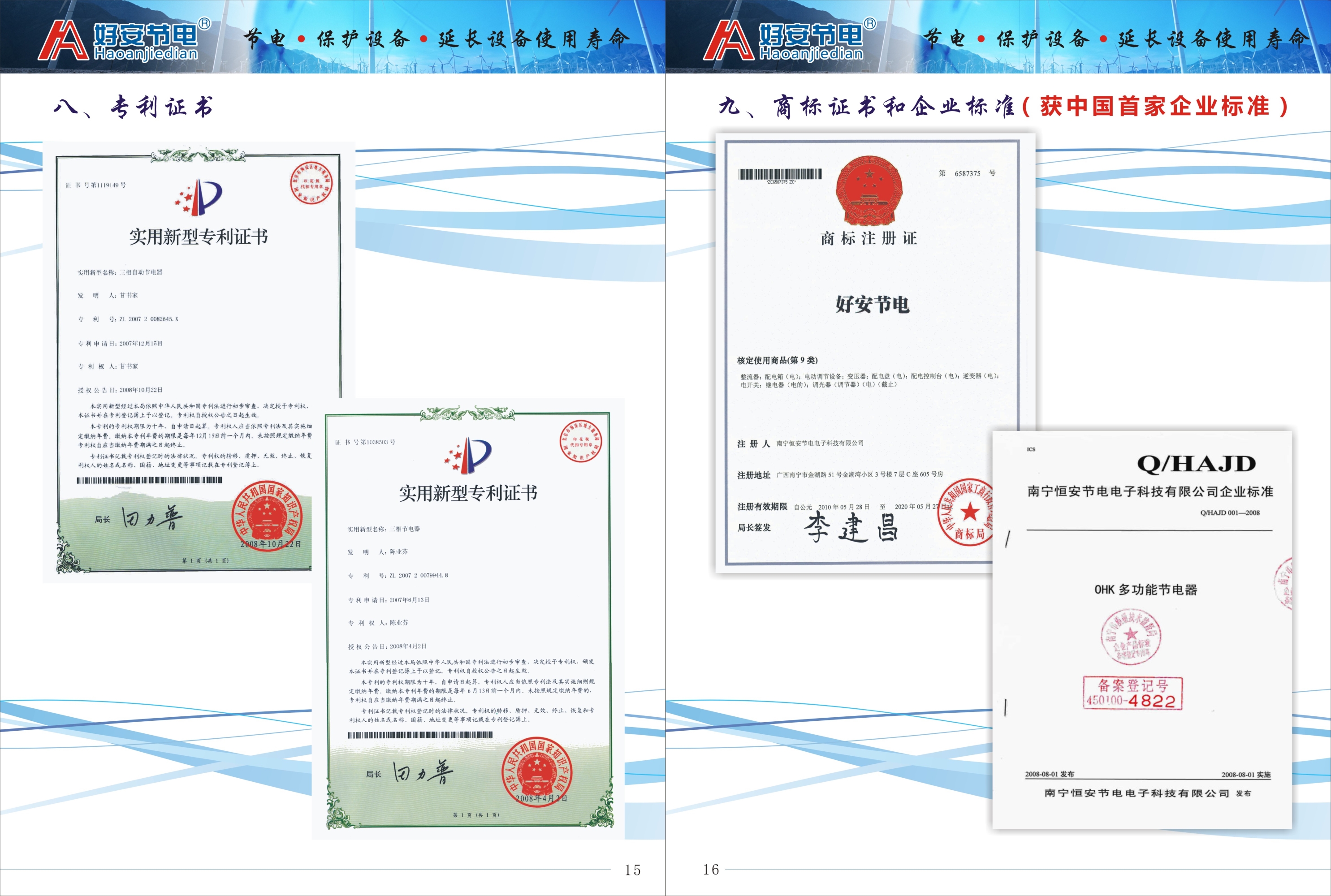 2007年起,南宁恒安节电电子科技有限公司打破了国内外节电行业的技术壁垒,公司将这种珍贵的节电核心数据进行周密的数字化设计,集合成可自动识别并自动调节电压的电网高效能优化智能分析软件,并向国家申请了技术,2007年国家总局正式批准了ZL200720079944.8/ZL2007 20082645.X两项。这一科研成果得到了时任国家党组书记、副部长李学勇及中央领导同志充分肯定。 同年好安节电系列节电器及我公司被评为中国能源战略高层论坛优秀科技创新项目中国节电器制造品牌中国节电器制造10强企业中国科技创新100强中小企业,发明人同时获得世界优秀发明家国家高级研究员称号。